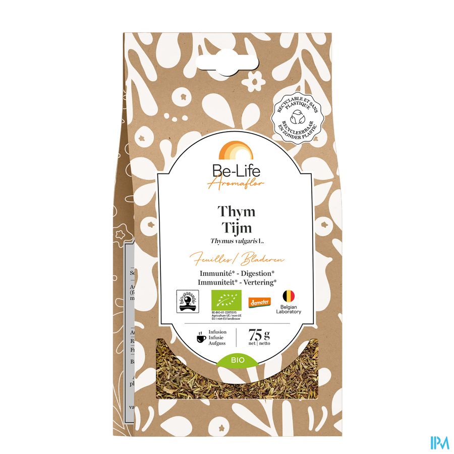 Aromaflor Thym Bio Be Life 75g est un complément alimentaire disponible en pharmacie. Il ne peut se substituer à un mode de vie sain et à une alimentation variée et équilibrée. Ne prenez pas plus que la dose quotidienne recommandée indiquée sur l'emballage. Demandez conseil à votre pharmacien. Tenir hors de portée des enfants.